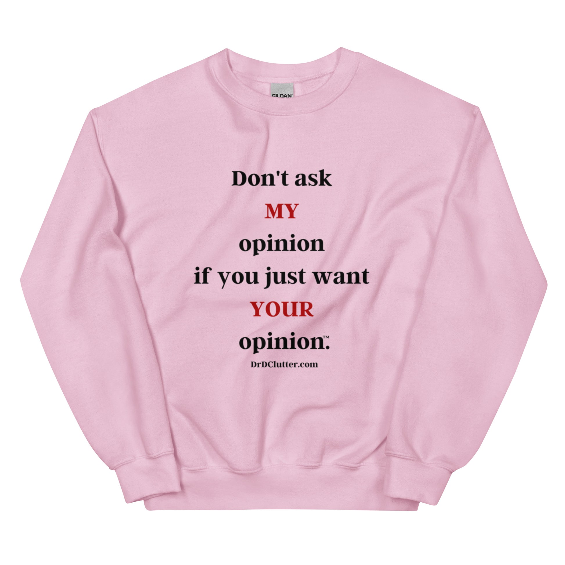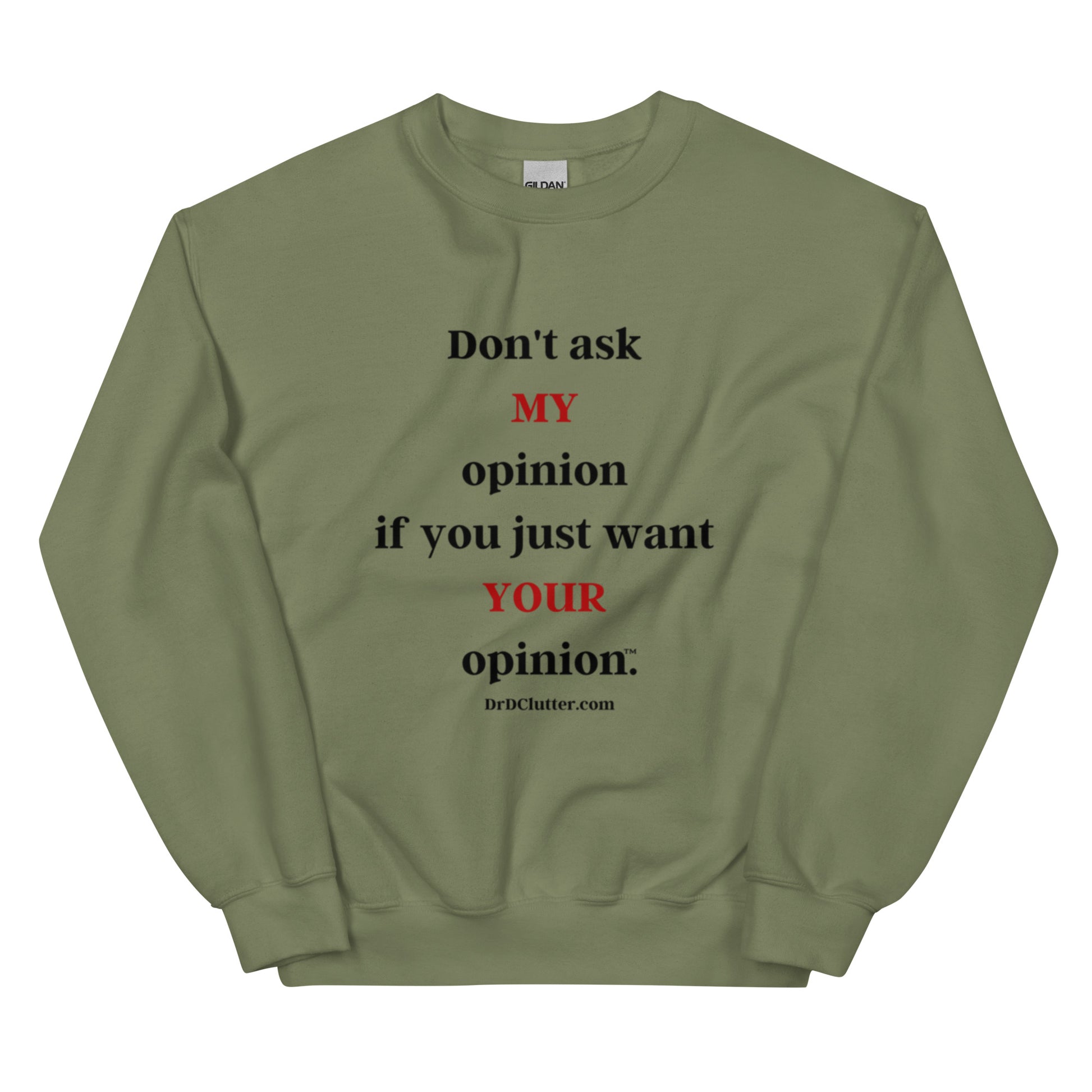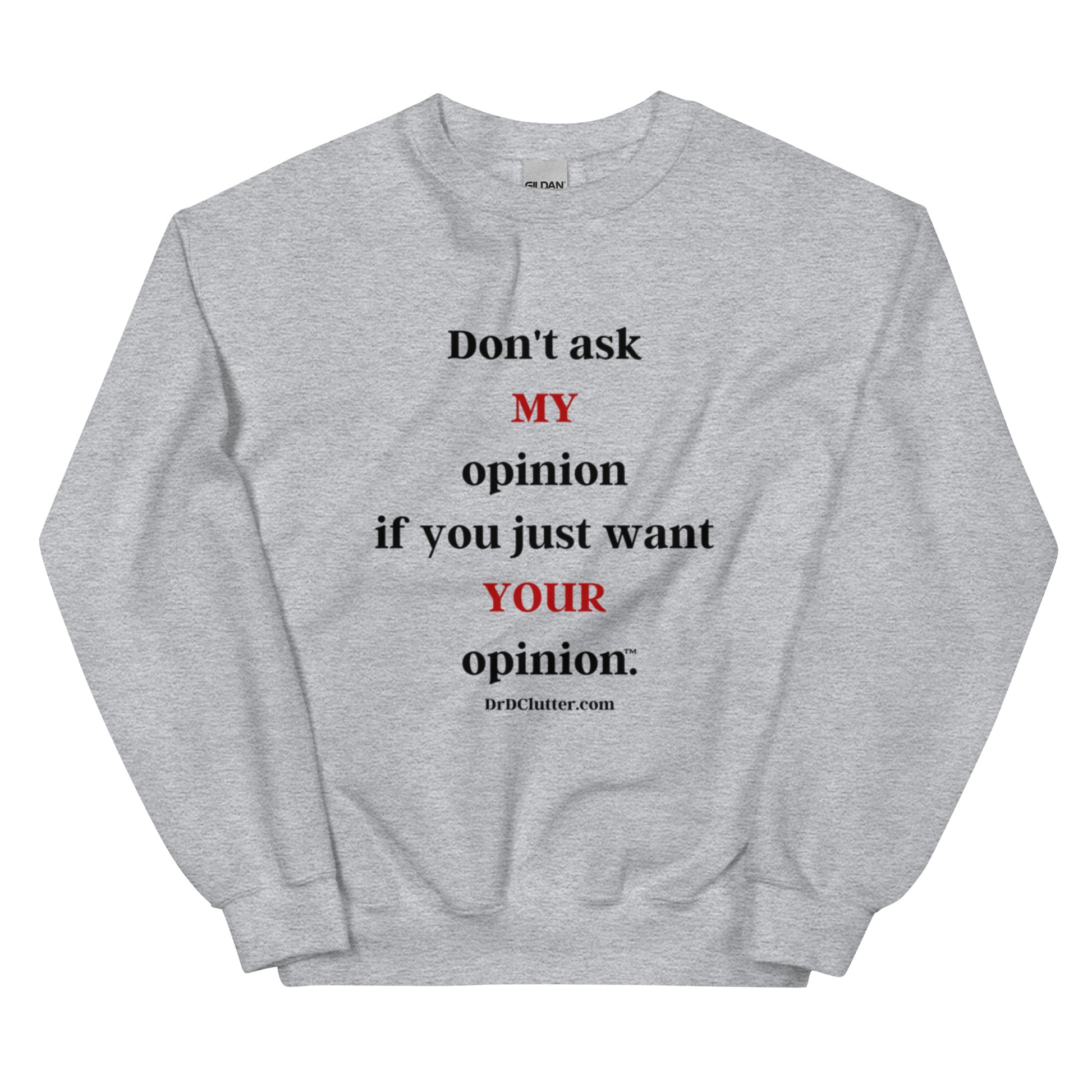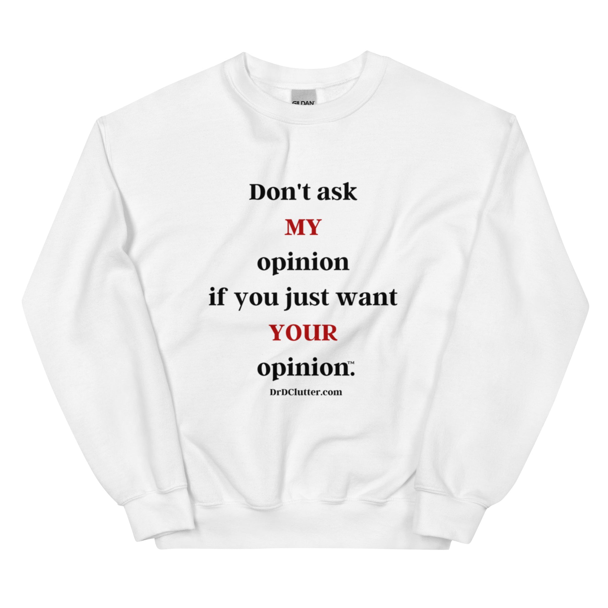 Our Crewneck Sweatshirt features the message, “Don't ask MY opinion if you just want YOUR opinion™”. Imagine you’re the sought after voice of advice and reason, a wealth of wisdom, the one with all (or most) of the answers, but you’re often left to wonder: “Why bother seeking my insight if all you really desire is a glorified echo chamber for your own insights and thoughts??”