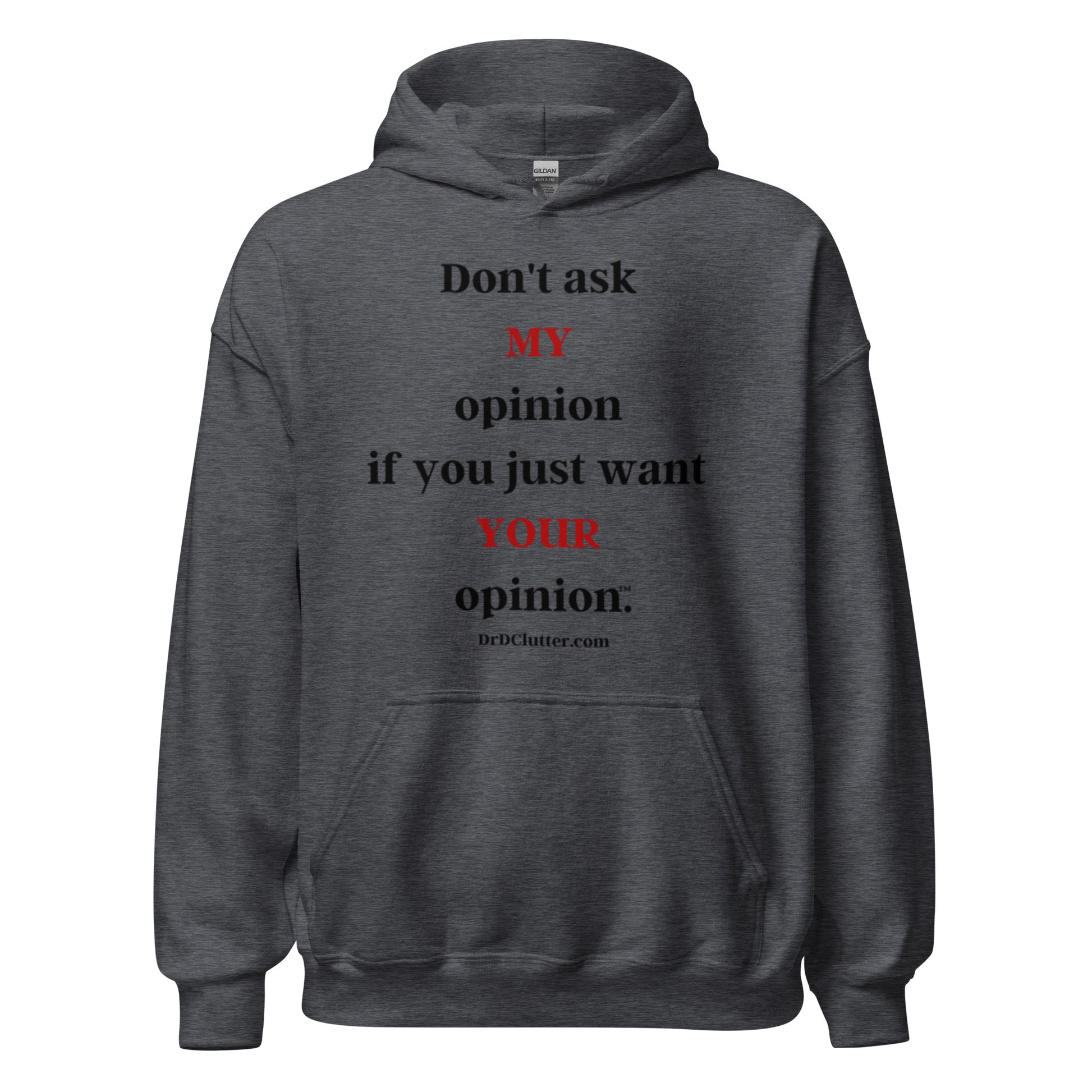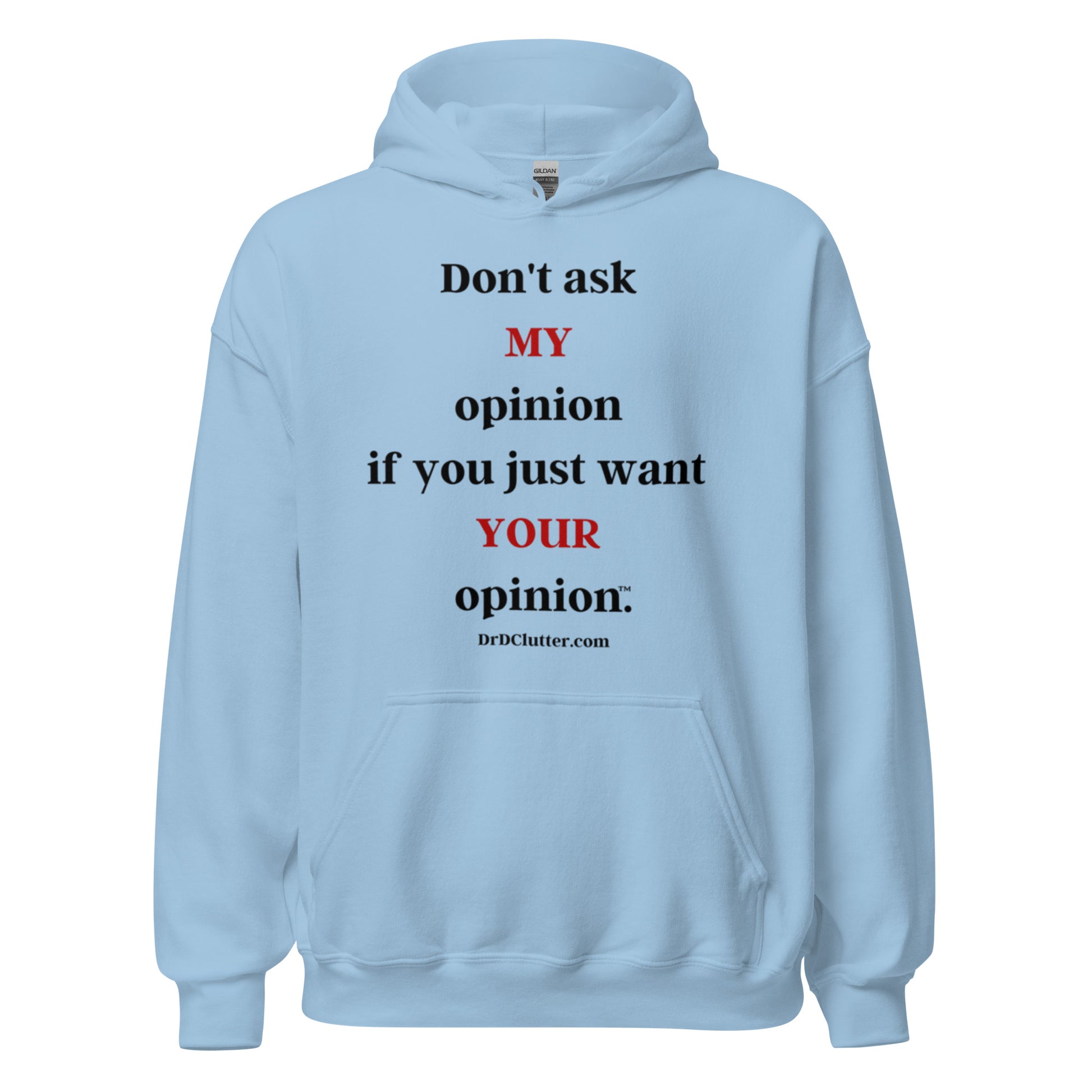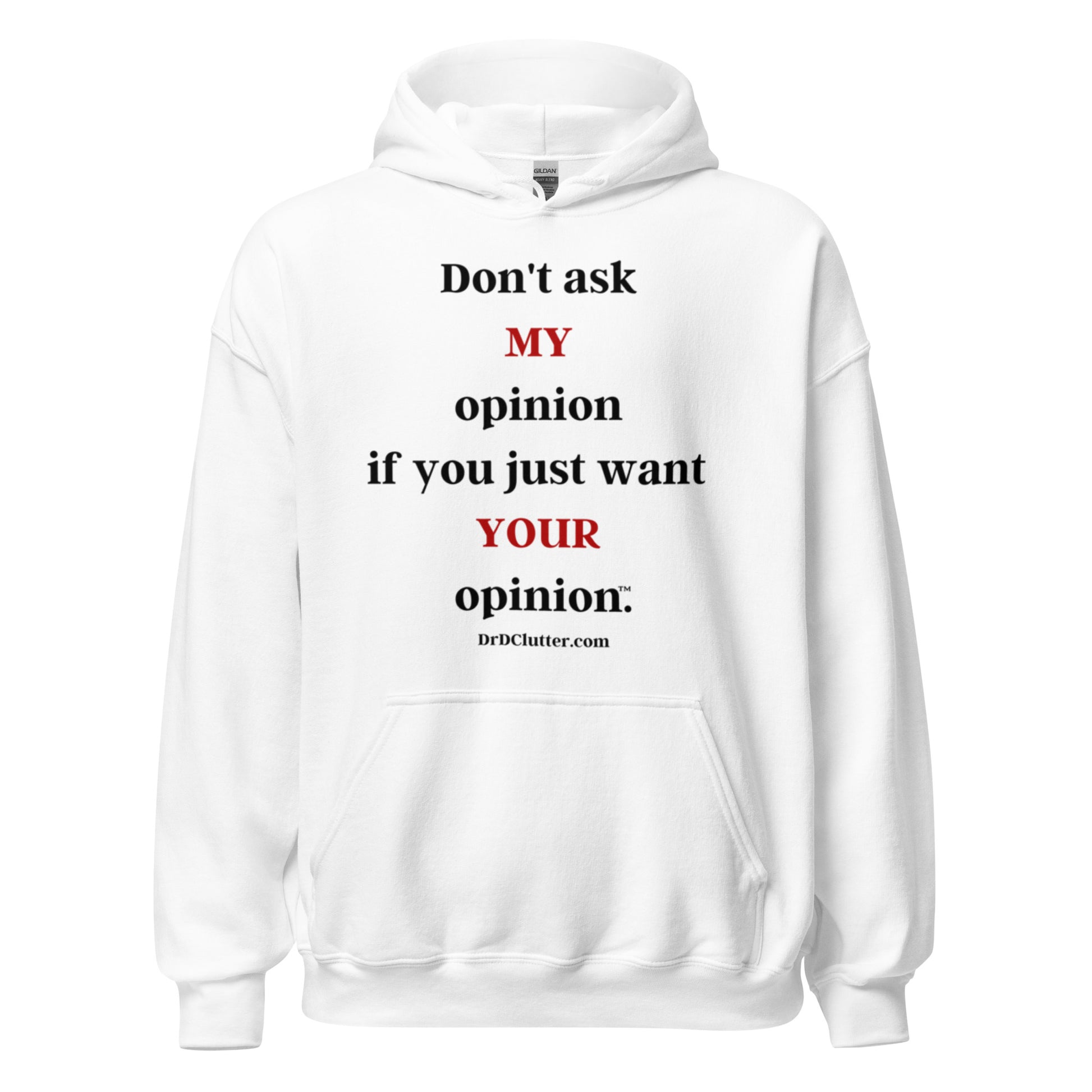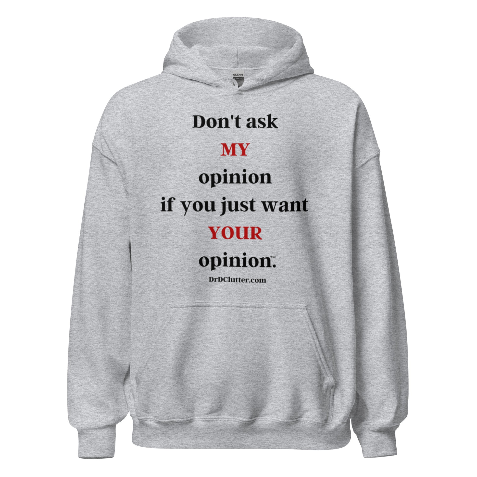 Our Hoodie Sweatshirt features the message, “Don't ask MY opinion if you just want YOUR opinion™”. Imagine you’re the sought after voice of advice and reason, a wealth of wisdom, the one with all (or most) of the answers, but you’re often left to wonder: “Why bother seeking my insight if all you really desire is a glorified echo chamber for your own insights and thoughts??”