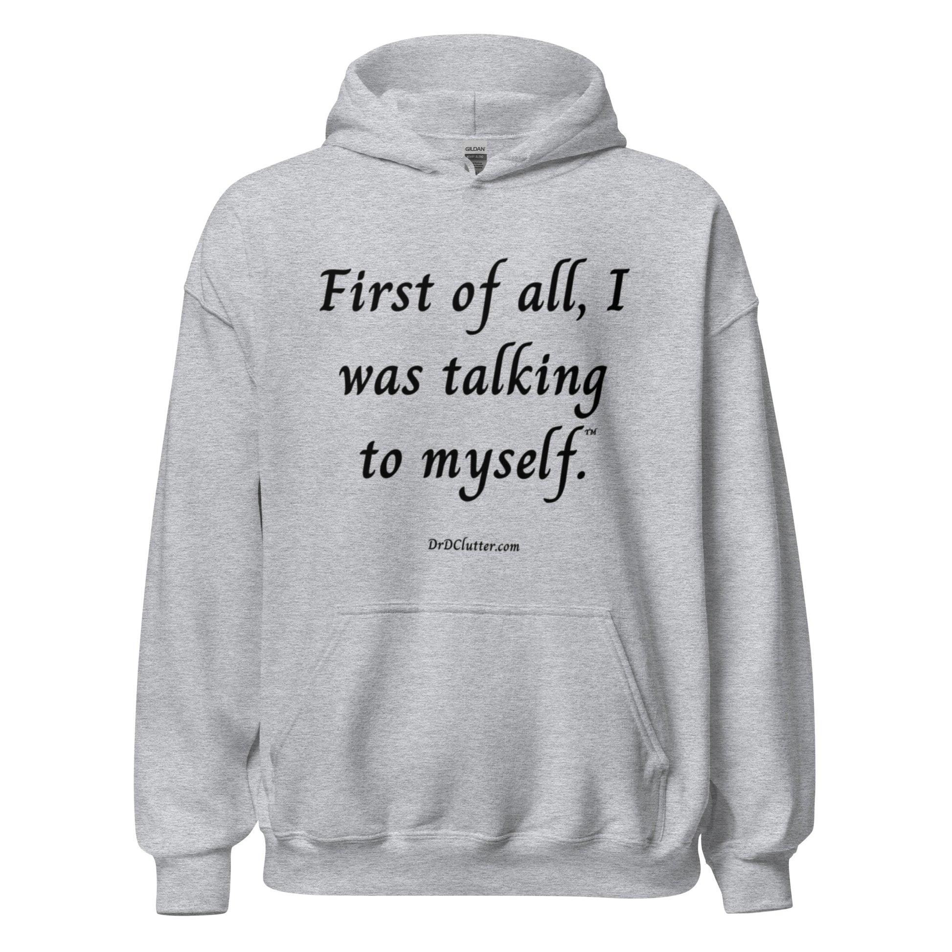 Our Hoodie Sweatshirt is the perfect way to start your day. Featuring the hilarious saying, "First of all, I was talking to myself™.”, it is sure to bring a smile to your face.