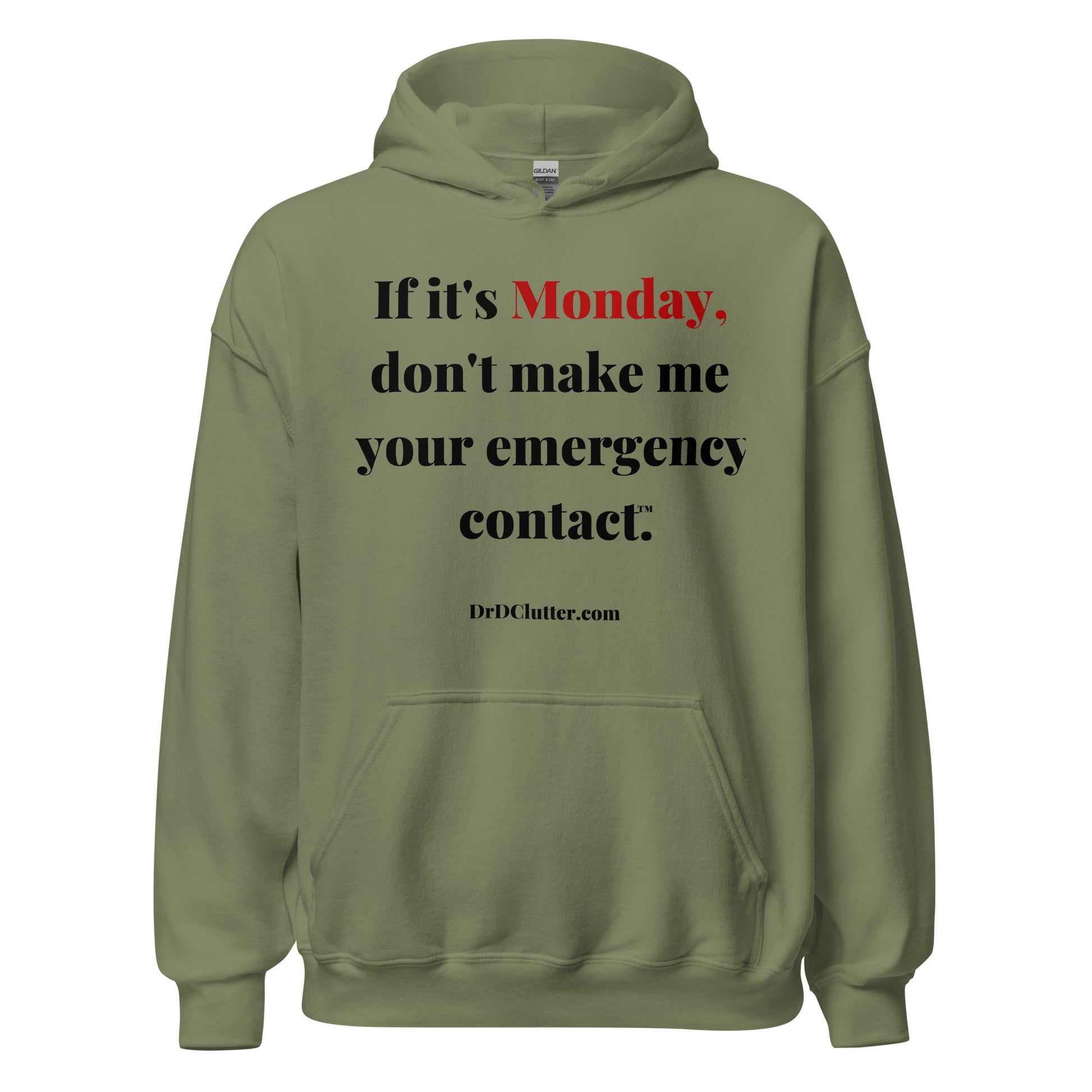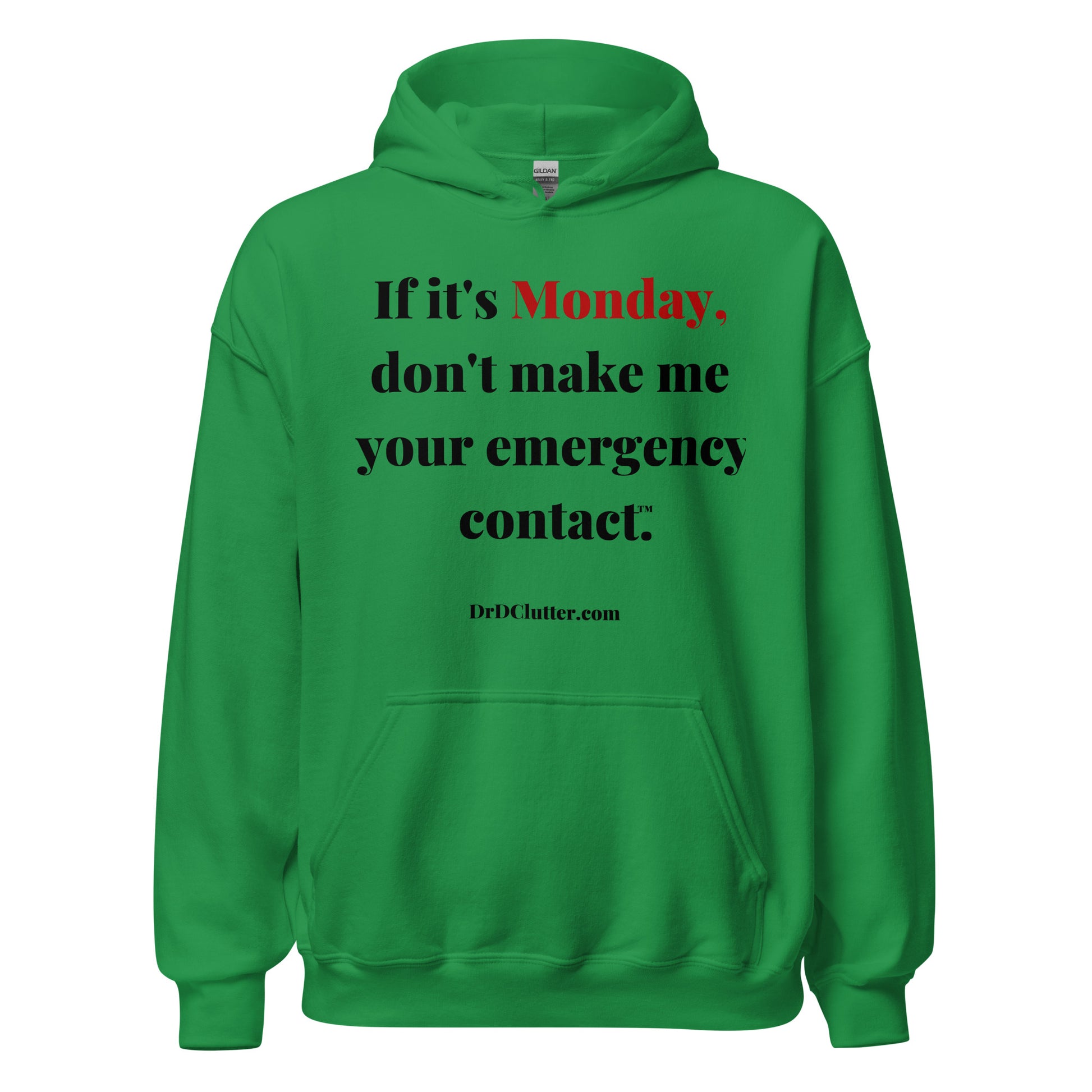 Our Hoodie Sweatshirt boldly declares, “If it's Monday, don't make me your emergency contact™., with wit and humor, that you are NOT the go-to person on Mondays when it comes to emergencies.