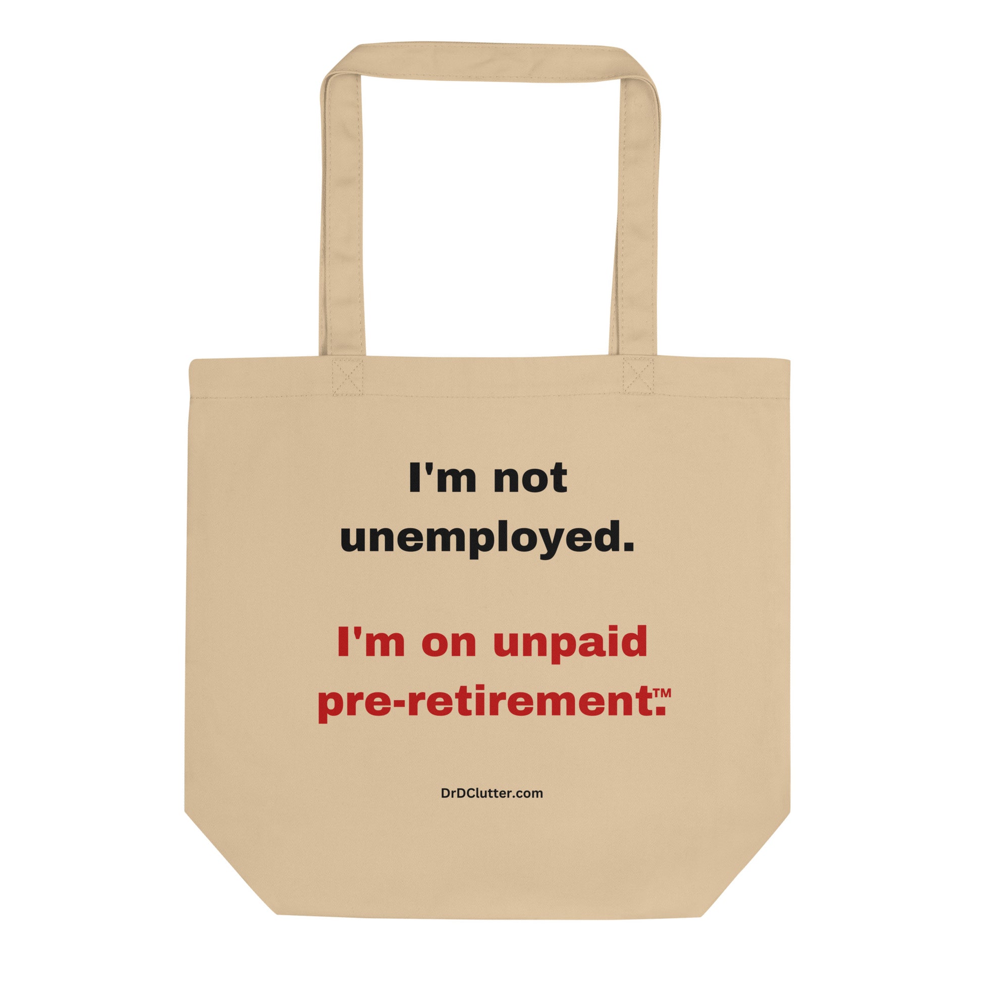 This Eco Tote is the perfect way to add a touch of humor to your daily routine. Say goodbye to plastic, and bag your goodies in this organic cotton tote bag, with more than enough room for groceries, books, and anything in between. Express your individuality, make a statement and be kind to our world with our Eco Tote featuring the humorous and witty phrase, "I'm not unemployed. I'm on unpaid pre-retirement™." It’s a real-life saying for those times when you may be in that “in-between” state in life of working (or not working but still trying), yet anticipating “quitting time.” You don’t give up. You keep going!!