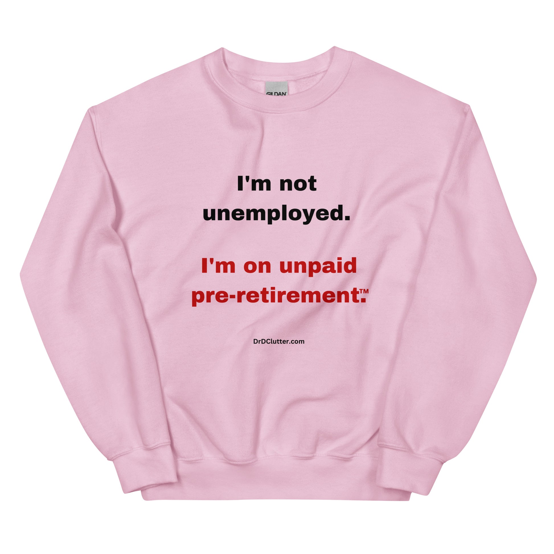 Whether you're gifting it to yourself or a fellow pre-retiree, our "I'm not unemployed. I'm on unpaid pre-retirement™."Crewneck Sweatshirt is a fantastic way to celebrate this unique phase of life. It's also a great conversation starter and a fun addition to your wardrobe. Embrace the humor and anticipation of pre-retirement with our delightful Crewneck Sweatshirt. Order your "I'm not unemployed. I'm on unpaid pre-retirement™" Crewneck Sweatshirt today and let everyone know that you're approaching retirement, or waiting patiently for it, with a smile.