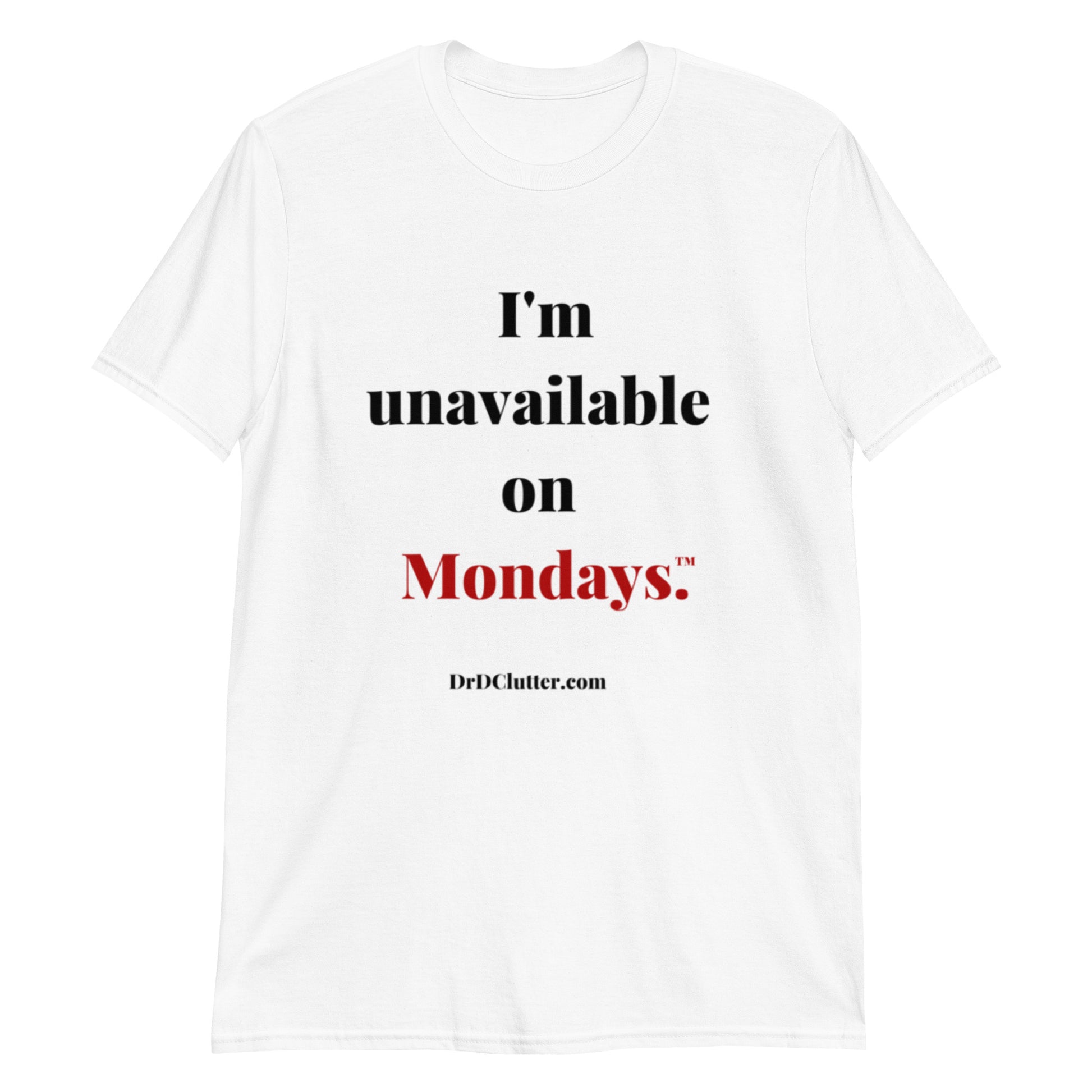 Our Classic T-Shirt boldly declares, with wit, "I'm unavailable on Mondays™”. With a touch of humor, you will let everyone know your availability status at a glance and that you are NOT to be disturbed on Mondays!! So, hang your “Do Not Disturb” sign, enjoy your Mondays and let the world know that you're taking a well-deserved break!!