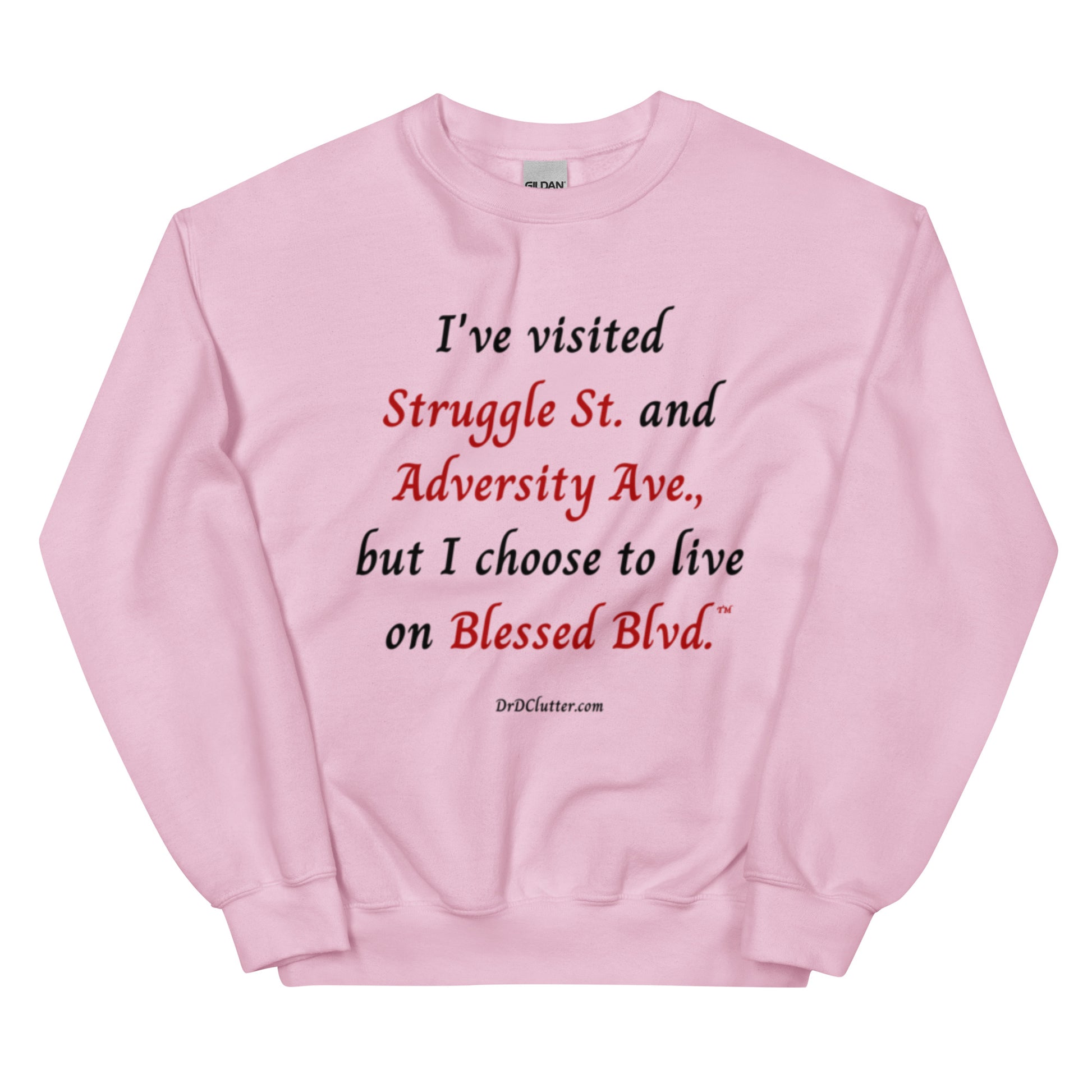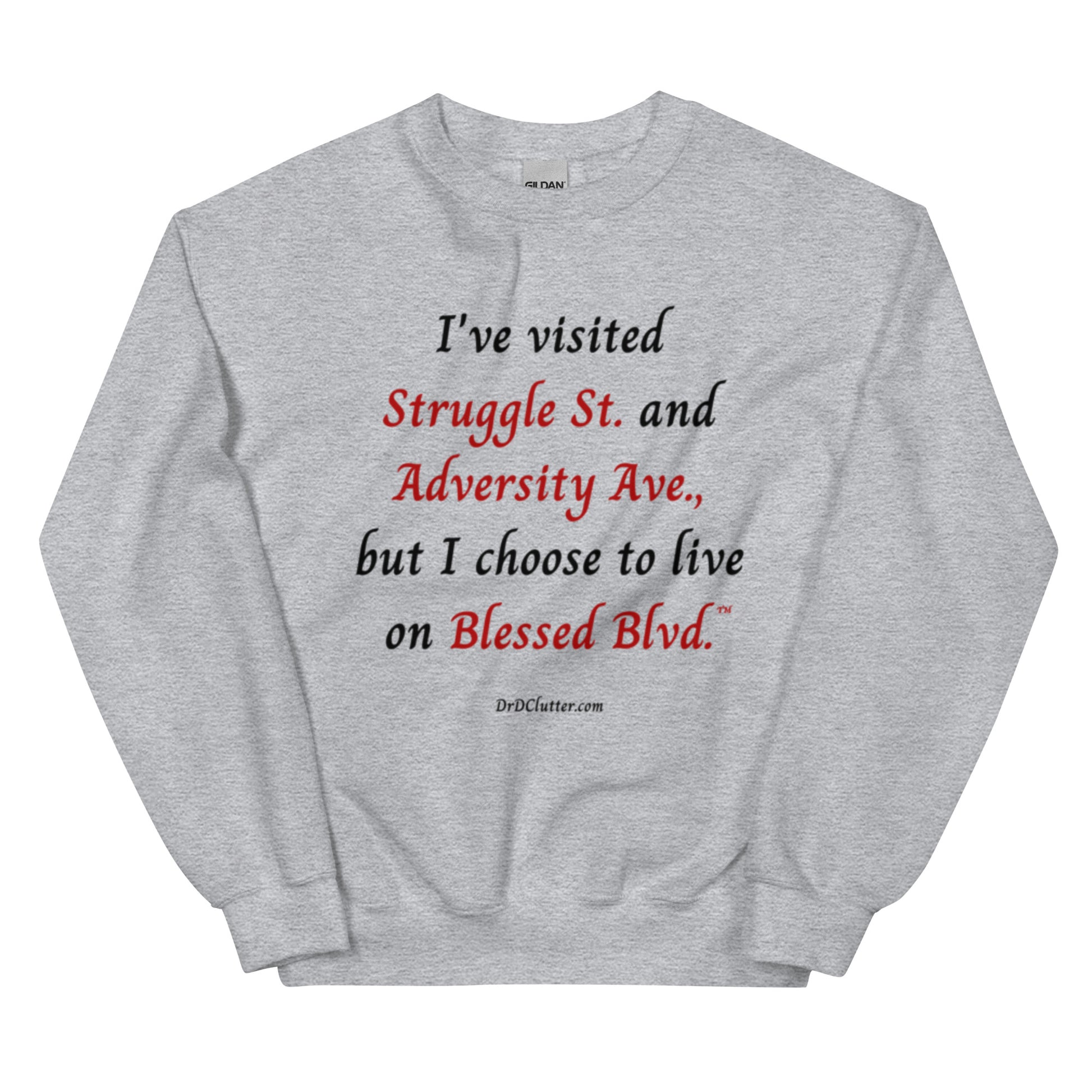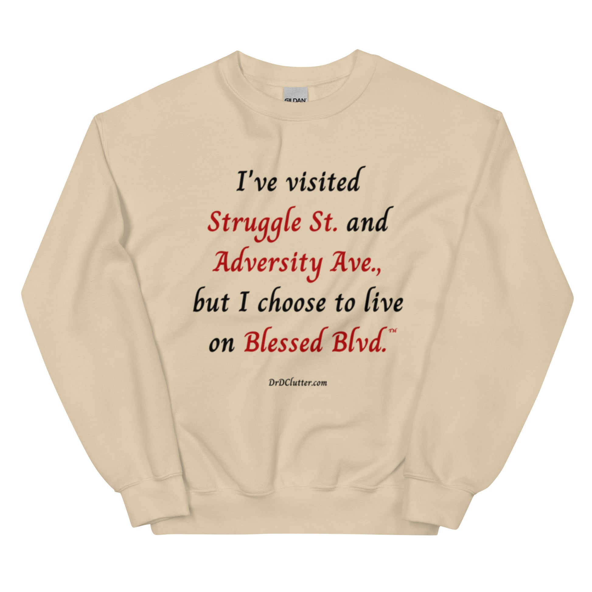 Our Crewneck Sweatshirt has a message of encouragement. ”I've visited Struggle St. and Adversity Ave., but I choose to live on Blessed Blvd.™" is a daily reminder of our choice in how we react to any given situation and to face each day with a heart of gratitude and thanks. This sweatshirt is a testament to your journey and the grace and strength you've been given along the way.