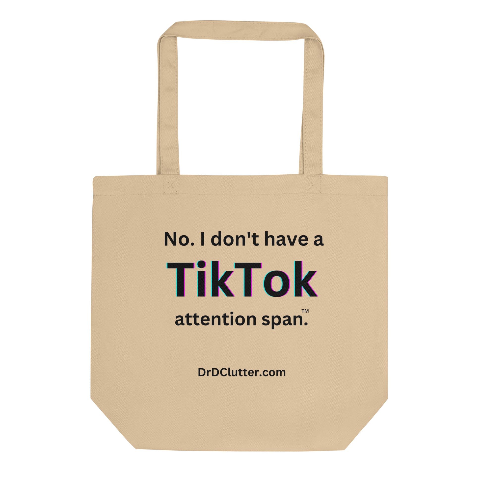 Featuring a bold and attention-grabbing lettering, this Eco Tote proudly displays the phrase "No. I Don't Have a TikTok Attention Span™.” It's a playful reminder that some of us prefer to savor moments and engage in deeper conversations rather than succumb to the fleeting trends of social media. We keep our focus!!