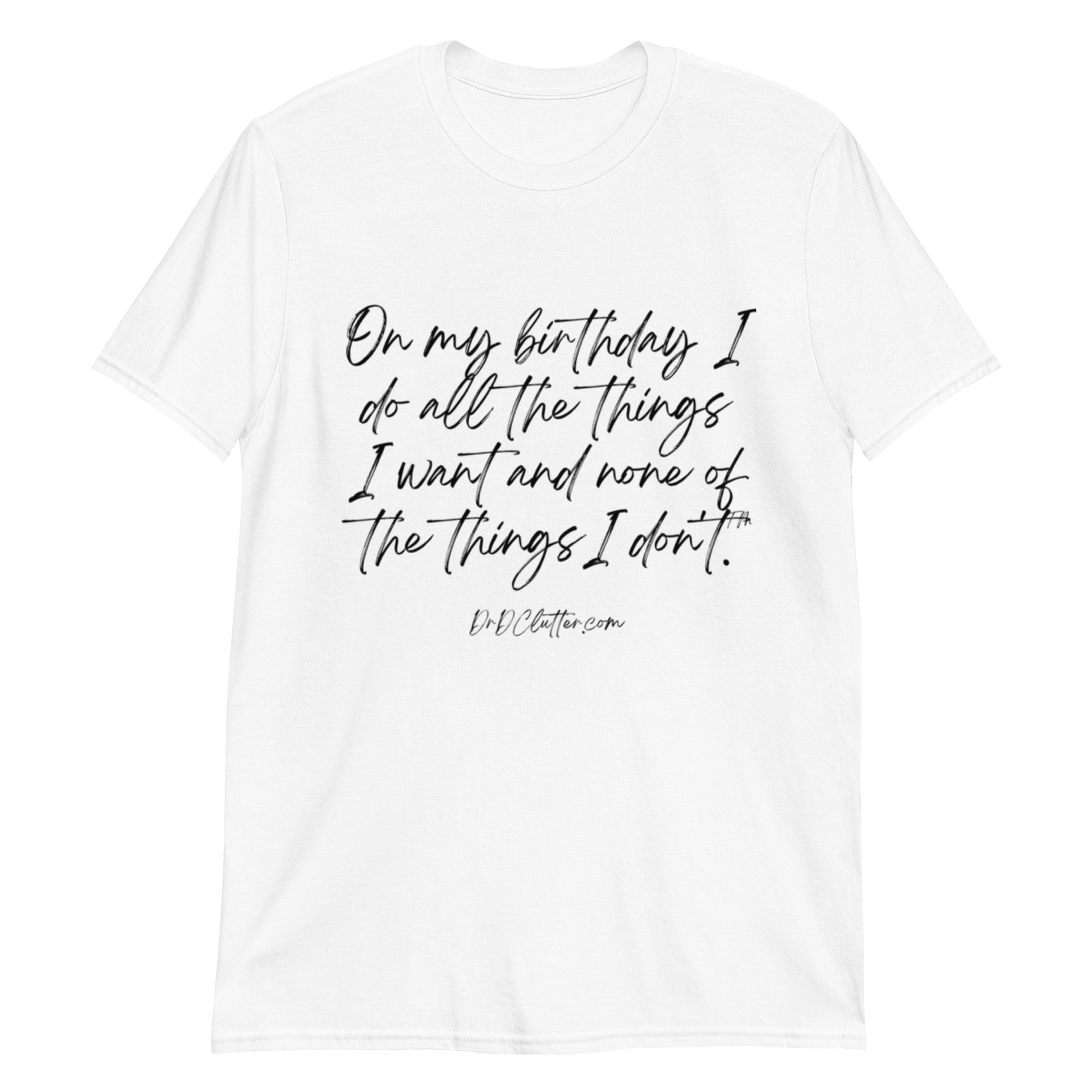 Do we REALLY need an explanation for this on our birthday?? Just in case, our Classic T-Shirt says it all-”On my birthday I do all the things I want and none of the things I don't™.”; sounds pretty straight forward, but just in case the message is NOT clear, this Classic T-Shirt conveys that you choose to enjoy all the simple or extravagant pleasures on your birthday, while reserving judgement on other obligations on that day. Happy birthday!!