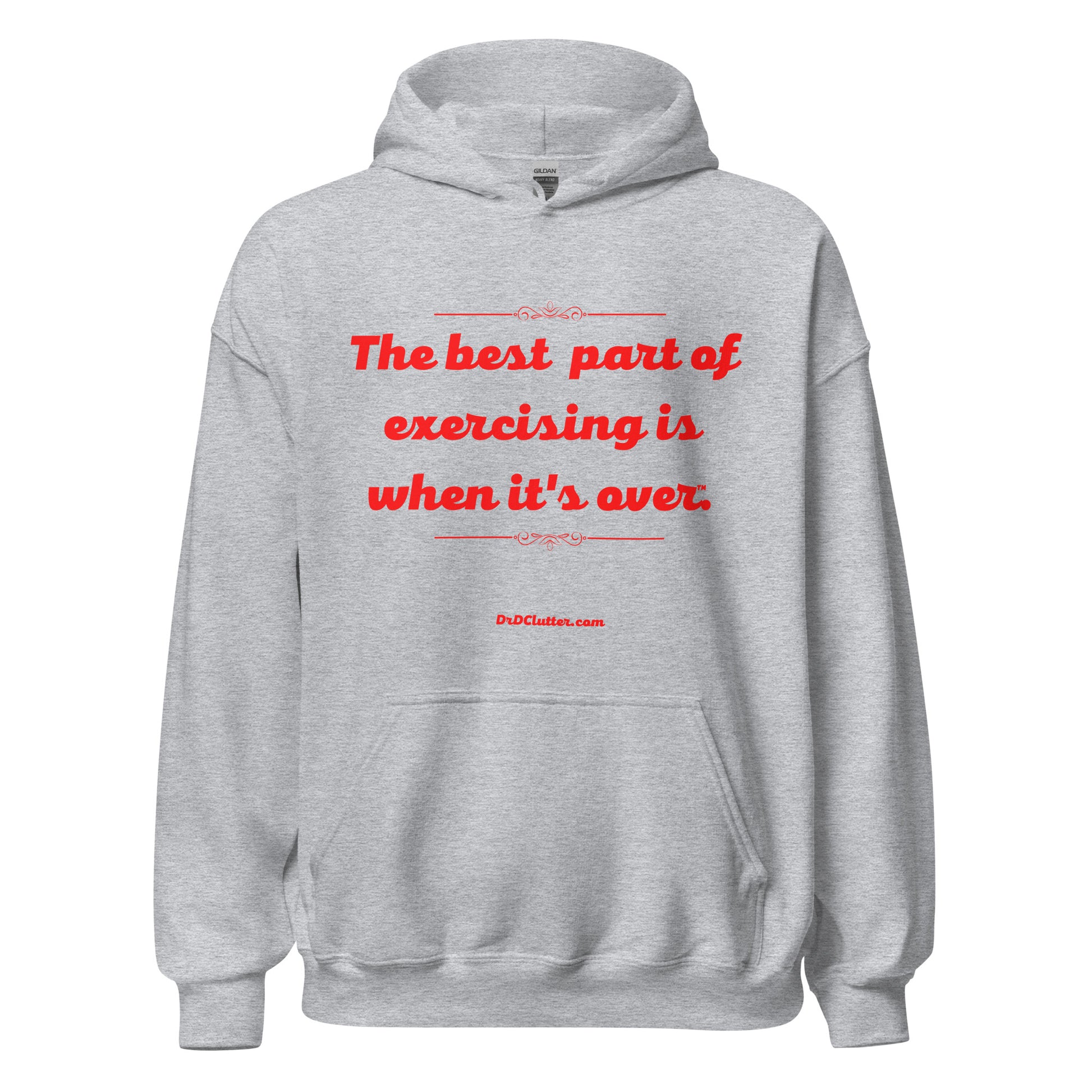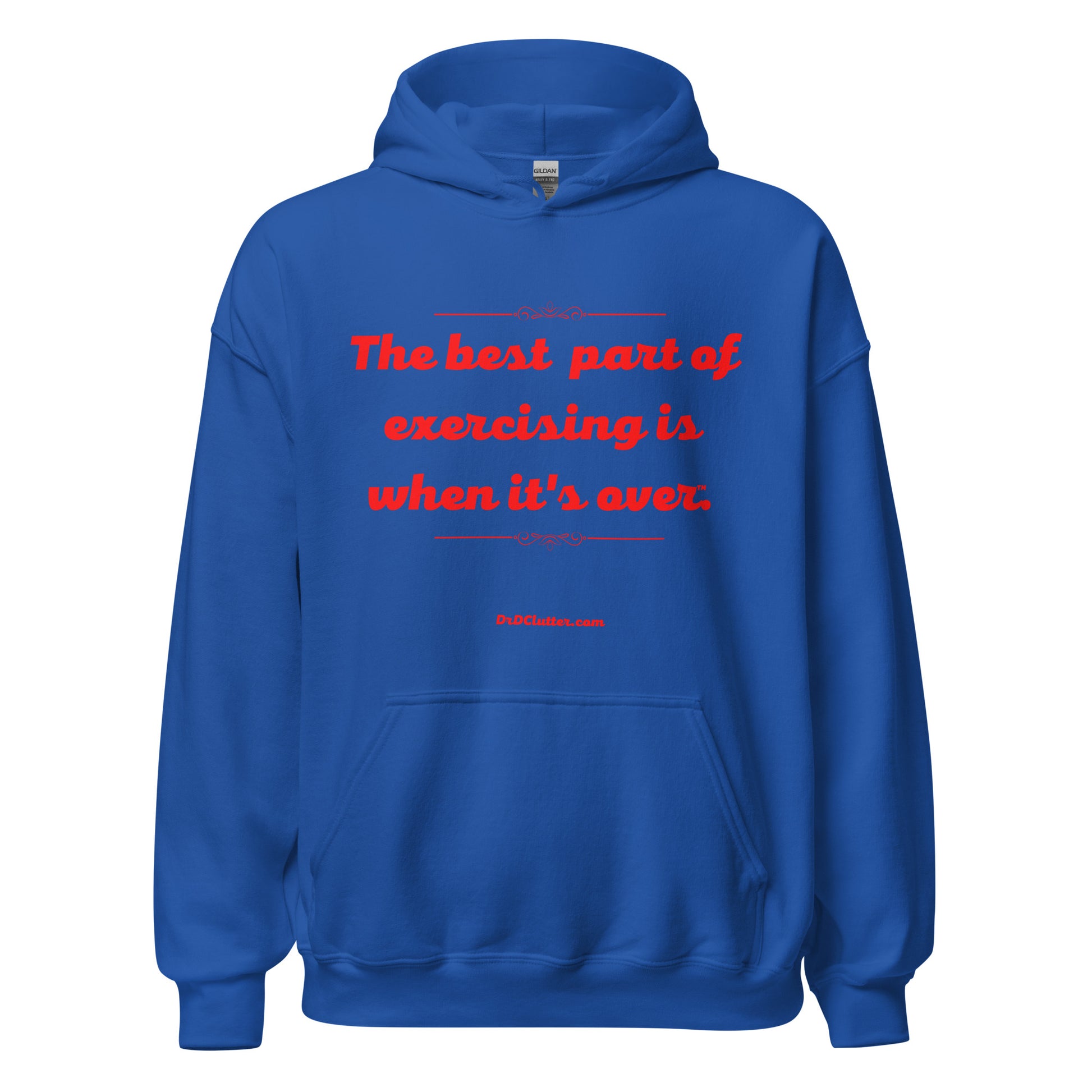 Our Hoodie Sweatshirt features the humorous, but true phrase, "The best part of exercising is when it's over™." It’s for you if you are serious about maintaining your health and fitness, but you celebrate when the workout ends!!