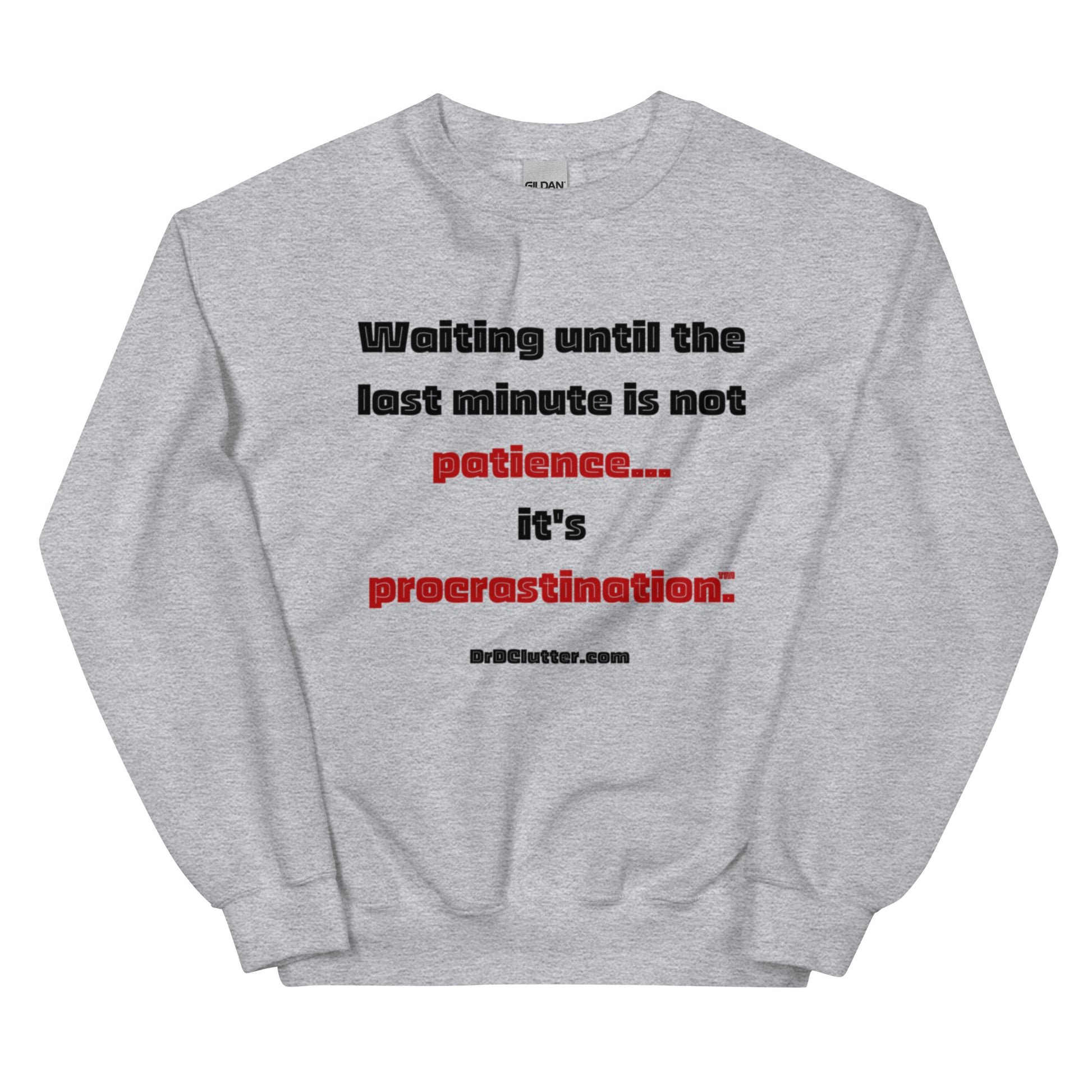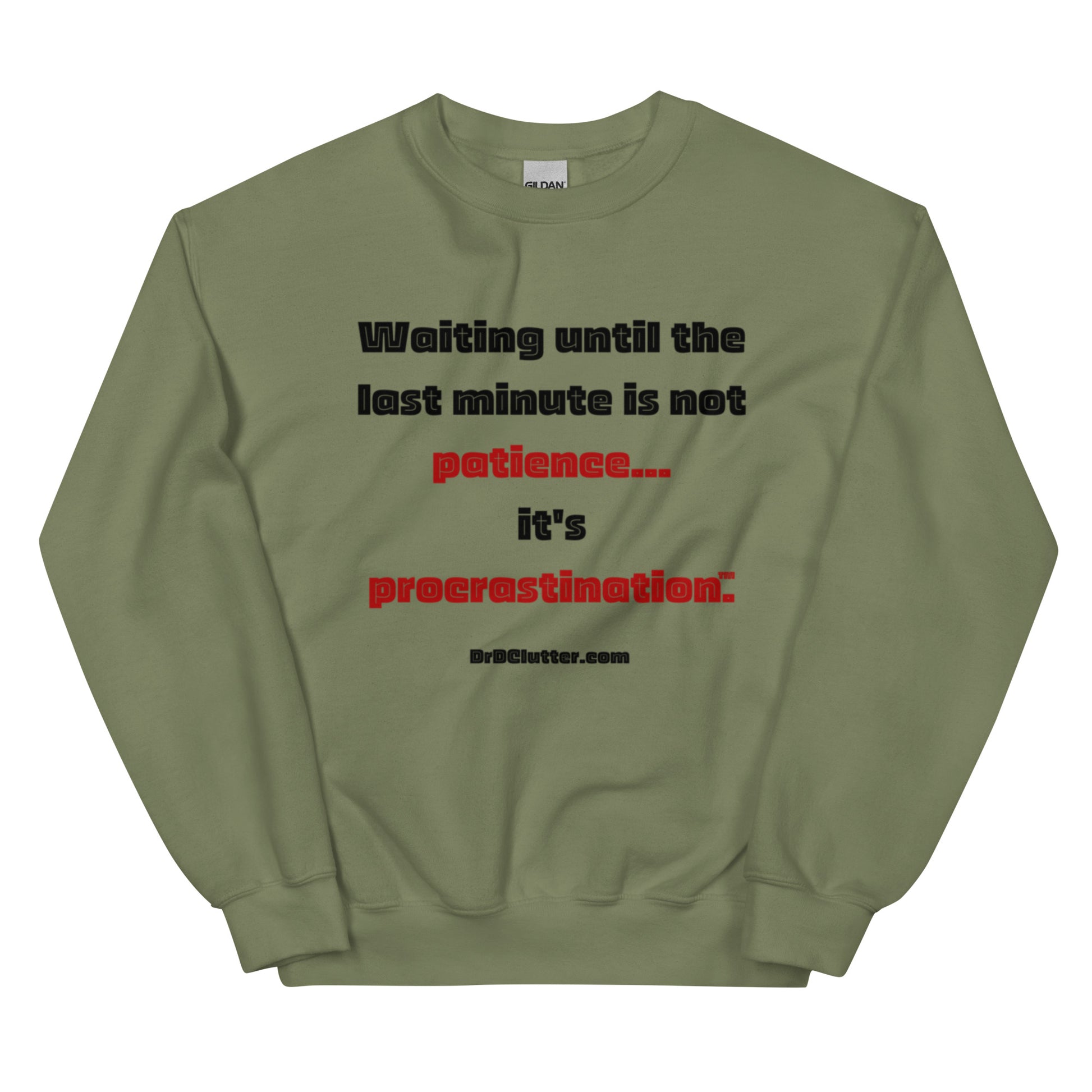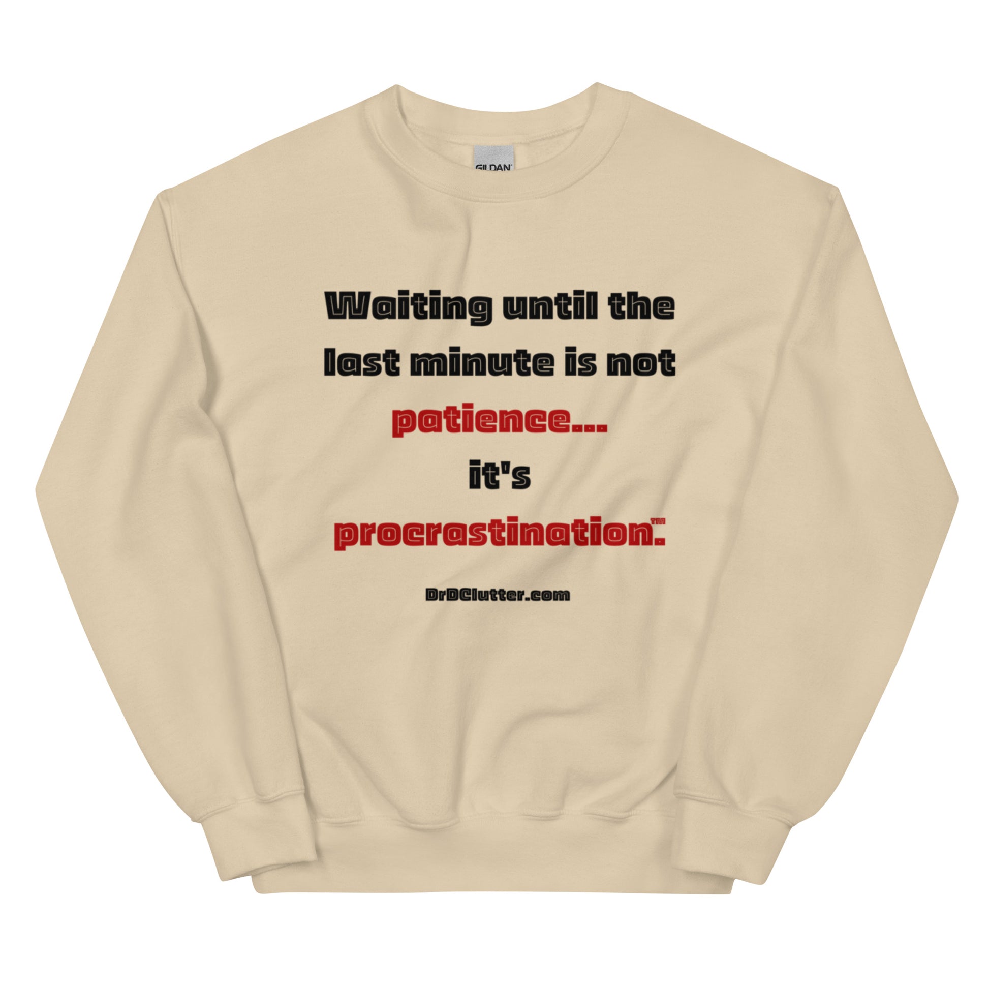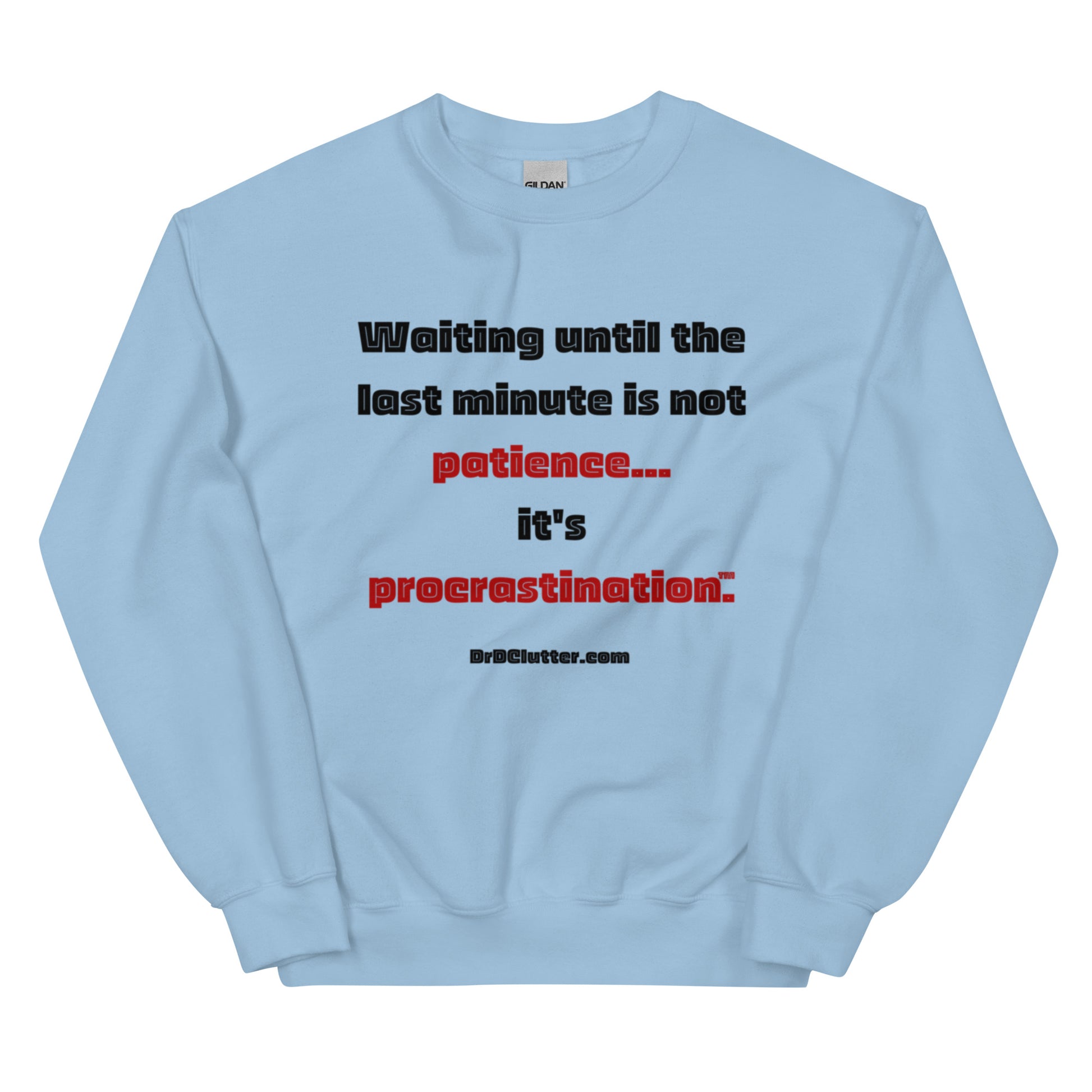 Our Crewneck Sweatshirt with its witty and humorous saying, ”Waiting until the last minute is not patience. It's procrastination™.” was made with you in mind!! Stay cozy and let the world know that you don’t thrive on the adrenaline rush of doing things at the eleventh hour, the last minute or down to the wire. With this stylish Crewneck Sweatshirt, you can show procrastination who’s BOSS. Don't wait until the last minute. Of course YOU won’t because you don’t waste time. Get yours–shop now!!