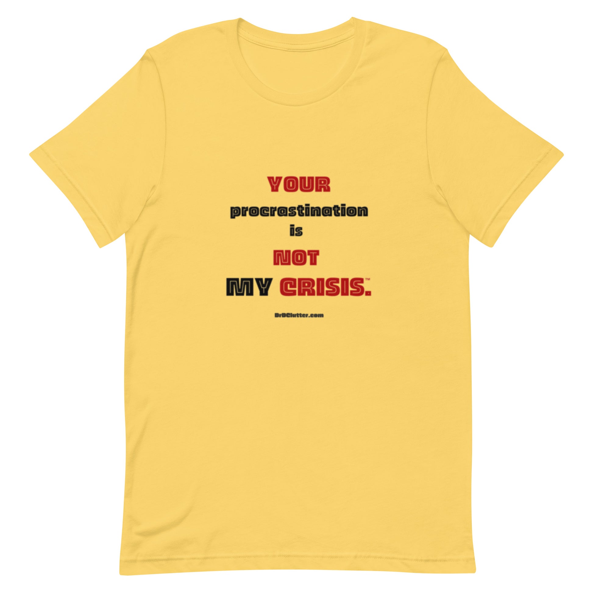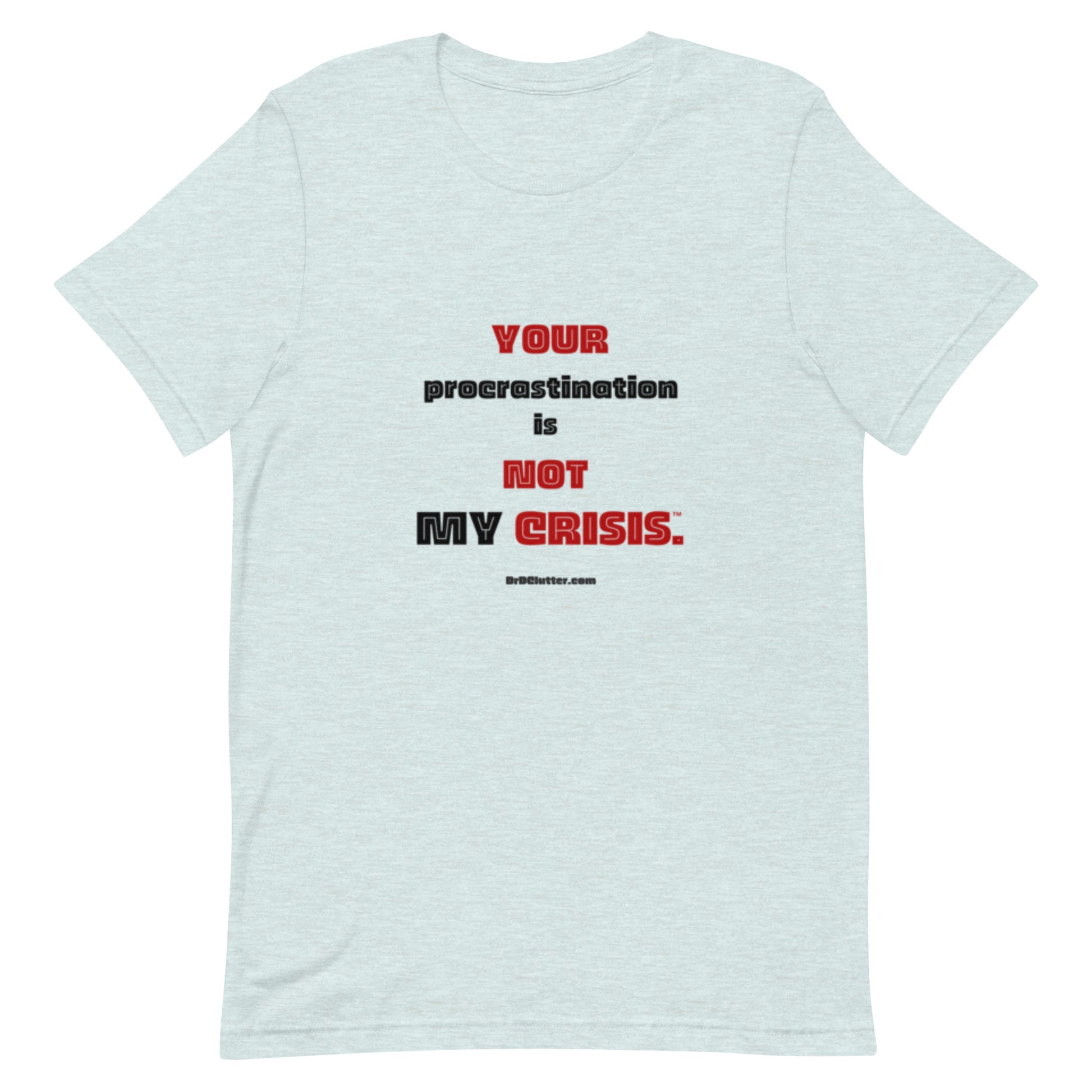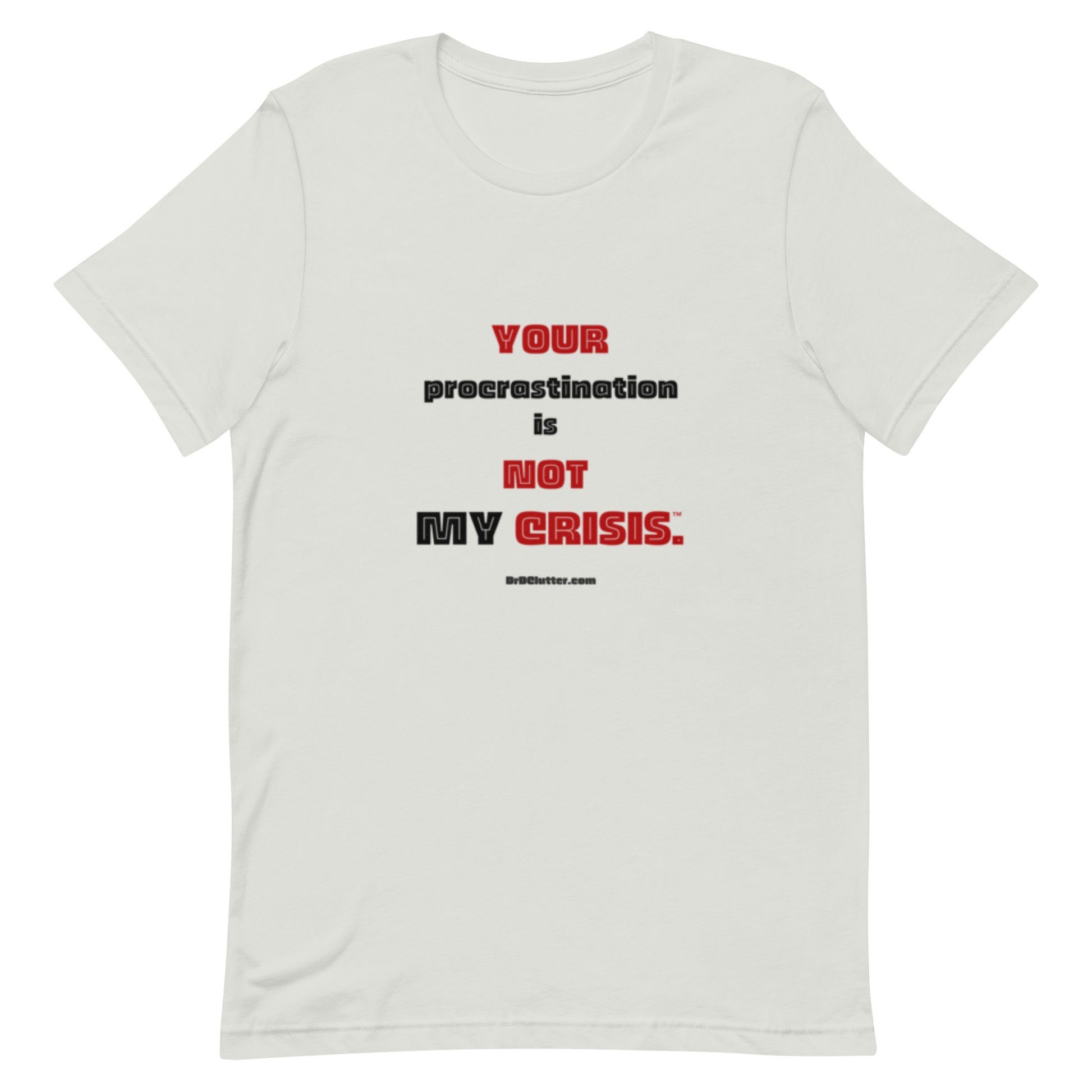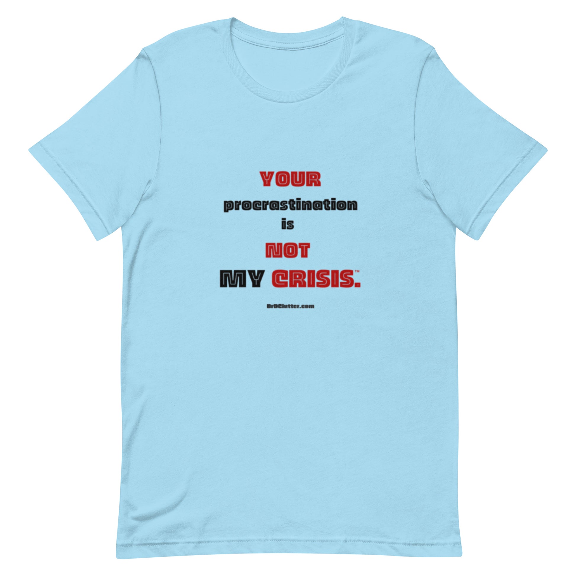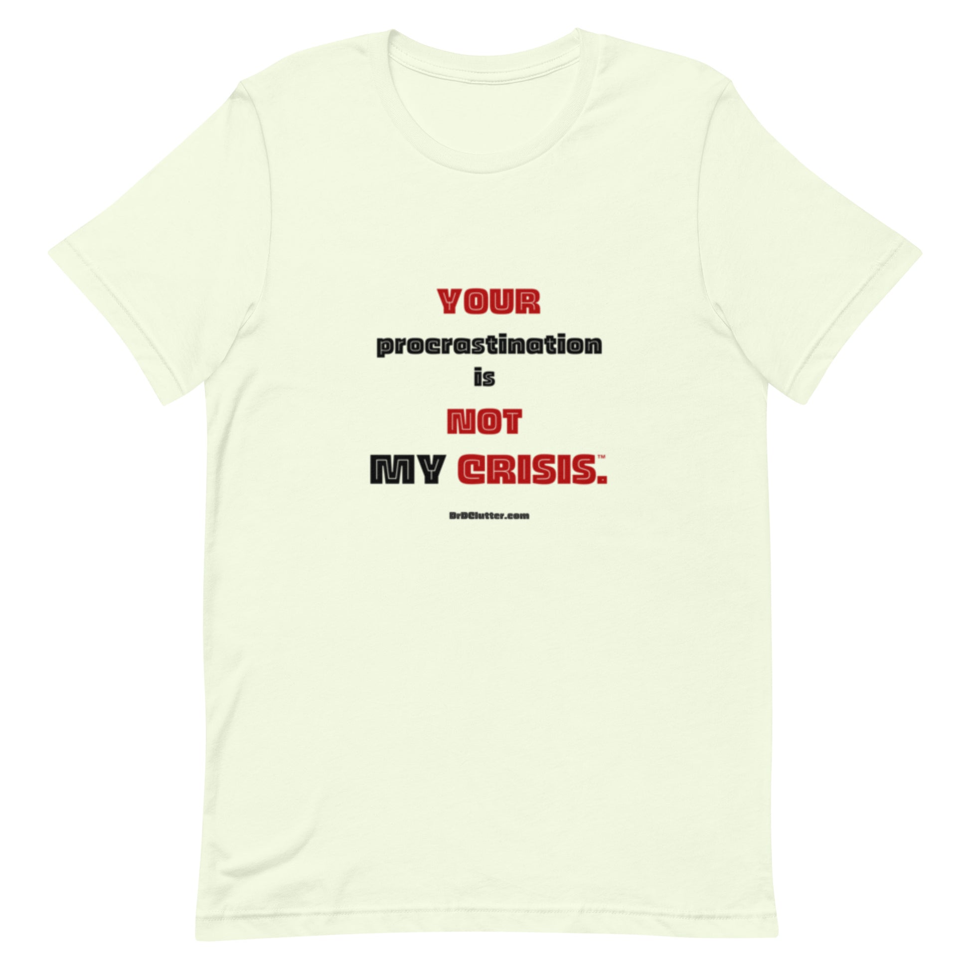 Our Premium T-Shirt declares loud and clear, “Your Procrastination is NOT MY CRISIS™.” This T-Shirt is the perfect message for those who refuse to let other people's procrastination become their own emergency/crisis situation.
